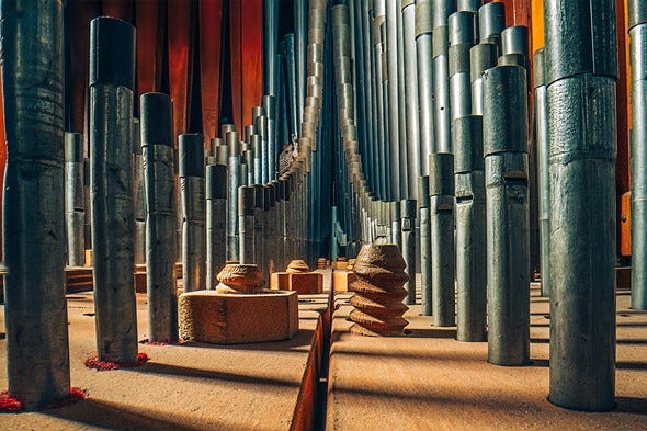 În fotografia de mai sus pare că e un oraș sau o uzină, dar în realitate e interiorul unei orgi, surprins de Charles Brooks. Brooks s-a orientat spre fotografie după ce a pus pauză carierei muzicale de violoncelist. Ideea i-a venit în timpul pandemiei, când, observând că mulți muzicieni își trimiteau instrumentele la reparat, a profitat de ocazie pentru a le fotografia interiorul. A vrut să facă asta fără să le demonteze, captând esența lor autentică, și a început cu un violoncel, folosind un obiectiv de tip sondă. (via